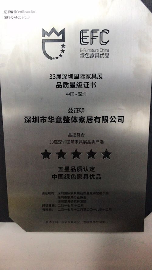 今年年初,華意空間正式申請(qǐng)第三批“中國(guó)綠色家具優(yōu)品”企業(yè),并成為第三批準(zhǔn)入資格企業(yè)之一;如今,華意空間正式收獲“中國(guó)綠色家具優(yōu)品”證書(shū),以及獲得首批參展商“品質(zhì)星級(jí)評(píng)定”五星品質(zhì)認(rèn)證,可謂“雙喜臨門(mén)”,也代表了華意空間的品質(zhì)率先得到深圳家協(xié)、專業(yè)檢測(cè)機(jī)構(gòu)及行業(yè)的廣泛認(rèn)可。