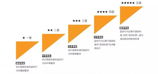 品質(zhì)星級評定,共分為六大等級標(biāo)準(zhǔn),最低1星標(biāo)準(zhǔn),參展商需提供符合國家標(biāo)準(zhǔn)的家具成品1頻次和關(guān)鍵原材料1頻次送檢的檢測報(bào)告,次高5星標(biāo)準(zhǔn),由專業(yè)的第三方檢測機(jī)構(gòu)對企業(yè)的品質(zhì)控制體系進(jìn)行全面審核,并以高于國家標(biāo)準(zhǔn)的歐盟標(biāo)準(zhǔn)對關(guān)鍵原材料及成品進(jìn)行嚴(yán)格抽檢,最高為5星+中國綠色家具優(yōu)品標(biāo)準(zhǔn),參展企業(yè)必須達(dá)到中國綠色家具優(yōu)品的各項(xiàng)要求。即是中國綠色家具優(yōu)品作為深圳展最高的參展標(biāo)準(zhǔn),在展會層面激勵(lì)、推動所有參展商向更高標(biāo)準(zhǔn)、更高品質(zhì)邁進(jìn),以持續(xù)提升中國家具的品牌形象和價(jià)值。