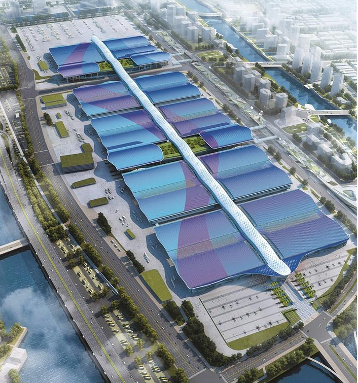 項目總建筑面積158萬平方米,功能涵蓋展覽、會議、演藝、體育、餐飲等,屋面藍色絲帶花紋,寓意“海上絲綢之路”。整體完建后,展示面積可達到50萬平方米,將超過德國漢諾威會展中心,成為全球規(guī)模最大的會展中心。