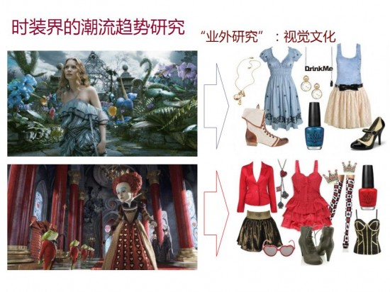 在時裝行業(yè),與社會文化進化的關(guān)聯(lián)超過其他各種行業(yè),是解譯潮流趨勢的第一種工具。 這些工具將從以前主要通過設(shè)計師的預(yù)見能力來實現(xiàn)的、未經(jīng)組織和無程式的應(yīng)用切換為有一系列精到技術(shù)的、有章法的應(yīng)用,它在時裝行業(yè)已經(jīng)形成專業(yè)的運行體系。圖1為依據(jù)電影《愛麗絲夢游仙境》的場景所提取的潮流元素如色彩、形態(tài)等,汲取靈感而設(shè)計的服裝。