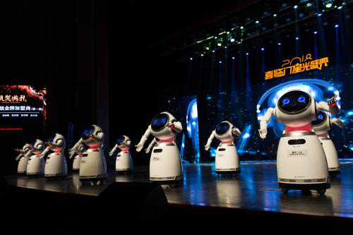 2018年2月1日,在紹興大劇院里,隨著舞臺(tái)懸板緩緩升起,一組造型萌翻了的白色機(jī)器人,展現(xiàn)在人們面前。他們熟練地拐彎,伸展、動(dòng)作,向著發(fā)出指令的“老板”前進(jìn)。