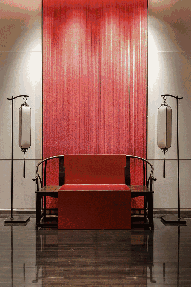 過廳,一抹明妍的鮮紅映入眼眸。絨線穿落其間的壁掛前,一張宋時簡椅,兩盞明式紙燈,朱紅與縞白互映,在細(xì)語交流中,空間更增添幾分東方古韻。