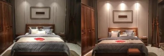 調(diào)燈后的效果為什么差異如此之大?燈的數(shù)量和功率也并沒有調(diào)整!這是通過天花可調(diào)角度射燈,將床屏,衣柜和衣架等重點要表達的點位進行對應調(diào)燈位,重點照明,營造較高的照度,讓其它地方暗下來,將消費者的目光導向最能體現(xiàn)體現(xiàn)產(chǎn)品價值的地方。