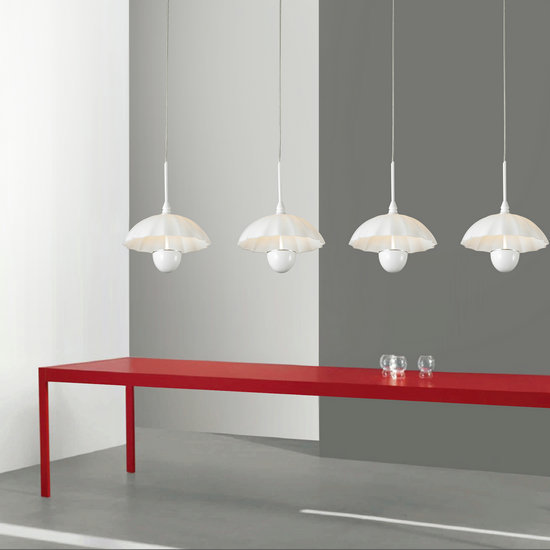 點(diǎn)評(píng)意見(jiàn):白色的燈體與黑白灰的室內(nèi)空間相得益彰,在這樣一個(gè)干凈簡(jiǎn)約的空間中出現(xiàn)了一抹高純度的紅色,為整個(gè)空間帶來(lái)了強(qiáng)烈的視覺(jué)沖擊力,降落傘造型的流線燈體柔化了空間硬朗線條帶來(lái)的冰冷感;黑色的燈體與黑色的桌子在灰白空間中給人呈現(xiàn)出的是一種酷酷的格調(diào);燈桿由直線變?yōu)榛【€時(shí),這款燈又為空間帶來(lái)了不同的精神內(nèi)涵,使得整個(gè)空間呈現(xiàn)出含蓄、寧?kù)o的氛圍。