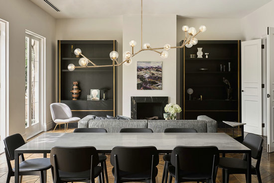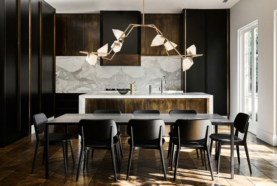 點(diǎn)評(píng)意見(jiàn):簡(jiǎn)潔現(xiàn)代、井然有序的空間秩序被餐桌上方的吊燈驟然打破,金色的黃銅材質(zhì)優(yōu)雅精致,是貫穿所有空間的提亮元素。不對(duì)稱的造型、自然有機(jī)的仿生形態(tài),在空間里加入了生態(tài)的氣息,左右橫出的枝丫與魚(yú)骨紋地板巧妙地形成了有趣的呼應(yīng),大小不一、方向各異的圓形燈頭,和直線構(gòu)成的室內(nèi)空間構(gòu)成了最佳的變異與調(diào)和。