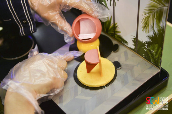 大城小食,展位上熙熙攘攘的人群都想嘗一口深圳。臺灣知名設(shè)計師曾熙凱聯(lián)合策劃“The Food & City•大城小食”創(chuàng)意設(shè)計,用食物設(shè)計的方式向世界傳達深圳故事、深圳文化和深圳精神,讓世界看到深圳的無限創(chuàng)意和活力。以食物做成家具部件,以餐盤作為房間地板,觀眾可以現(xiàn)場將各種部件組合,自由創(chuàng)造出屬于自己的家具,詮釋自我風(fēng)格,最后一口一口吃掉。