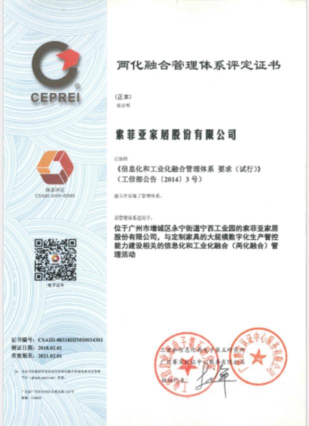 2018年2月,索菲亞家居股份有限公司成功通過了兩化融合管理體系國家工信部專家組的審查復(fù)核,獲得了由工信部電子第五研究所頒發(fā)的“兩化融合管理體系評定證書”, 成為定制家具行業(yè)中率先通過兩化融合評定的企業(yè)。