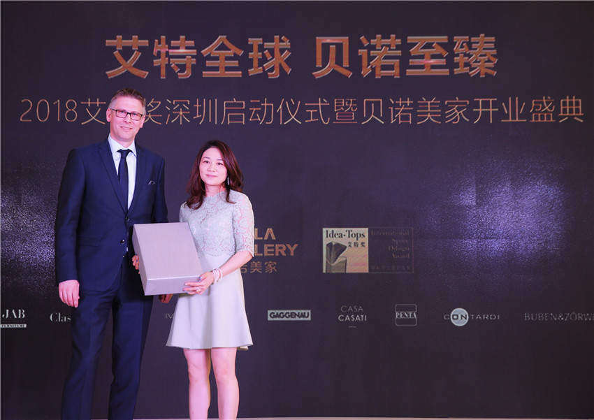 開(kāi)業(yè)典禮現(xiàn)場(chǎng),JAB家具總經(jīng)理Frank Rethman先生為貝諾美家第一位客戶陳太贈(zèng)送神秘禮品。陳太家的設(shè)計(jì)方案是德國(guó)JAB公司旗下設(shè)計(jì)師團(tuán)隊(duì)經(jīng)過(guò)深入溝通精心設(shè)計(jì)反復(fù)調(diào)整,最終確認(rèn)的方案。JAB ANSTOETZ,是一個(gè)被國(guó)際家居裝潢和室內(nèi)設(shè)計(jì)界高度認(rèn)同的奢侈品牌。秉承工匠精神,打造最優(yōu)質(zhì)的產(chǎn)品,極致手工定制創(chuàng)造藝術(shù)生活美學(xué),引領(lǐng)著全球每一季的時(shí)尚潮流。