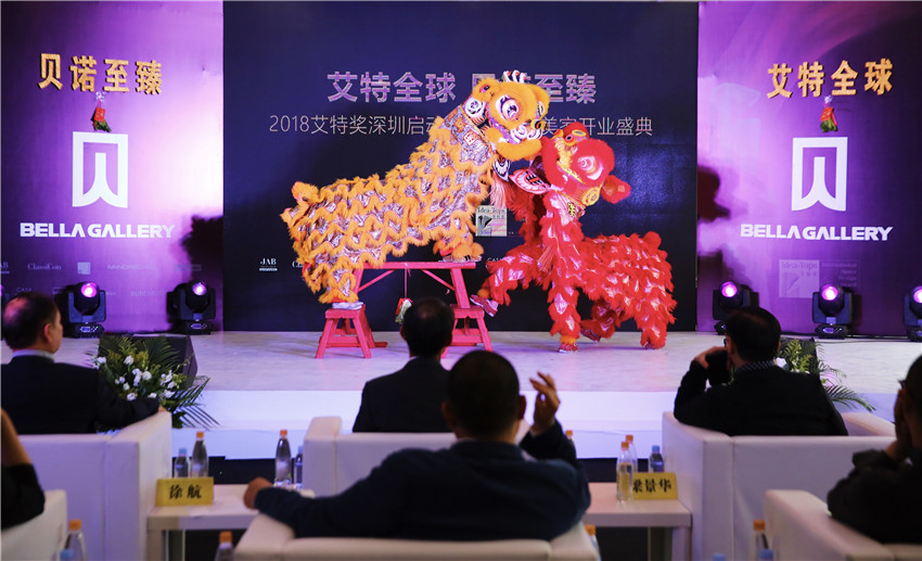 開(kāi)業(yè)剪彩前,中國(guó)傳統(tǒng)的象征吉祥如意的雄獅帶來(lái)精彩的“雄獅采青”表演。深圳市貝諾美家家居設(shè)計(jì)有限公司董事長(zhǎng)欒女士,艾特獎(jiǎng)組委會(huì)秘書(shū)長(zhǎng)、A963設(shè)計(jì)網(wǎng)副總裁何光會(huì)先生,共同為雄獅點(diǎn)睛,左點(diǎn)金,右點(diǎn)銀,中間點(diǎn)天下太平,寓意Bella Gallery從此接財(cái)納福,財(cái)源廣進(jìn)!