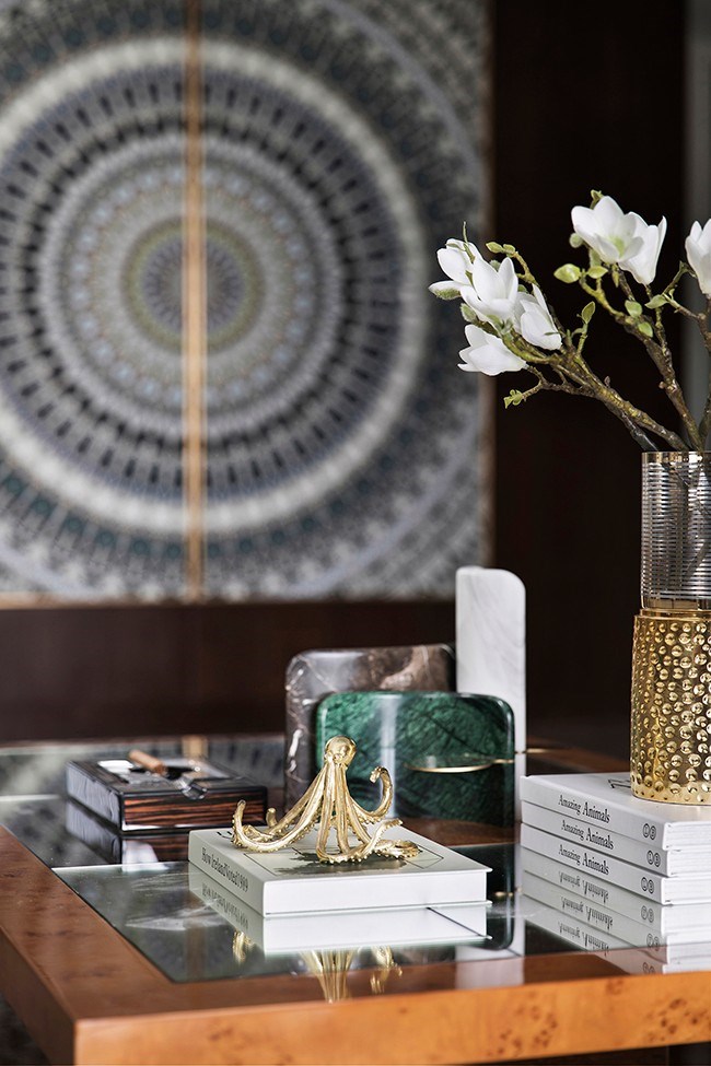 在整體明亮簡約的淺色大空間中,過廳處一面棕色原木墻超脫出來,賦予了空間朗朗氣度之美,設(shè)計師順勢而為,只以巨幅花紋裝飾畫裝點其上,層層發(fā)散狀的圓環(huán)花紋,神秘而富有張力,讓空間更顯氣韻生動。