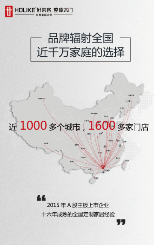 自2002年成立至今,好萊客始終立足現(xiàn)代家居市場(chǎng)需求、不斷引領(lǐng)行業(yè)潮流,致力于為全球消費(fèi)者定制專屬的舒適生活體驗(yàn)。2015年,好萊客成功上市,成為定制家居行業(yè)A股主板上市企業(yè)(股票代碼:603898),目前,好萊客加盟商遍布全國(guó)1000多個(gè)城市共計(jì)1600多家。