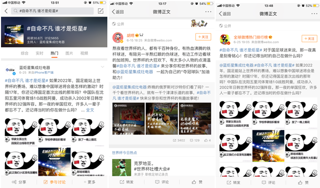 世界杯對(duì)于像藍(lán)炬星集成灶這樣做廚房電器的品牌來說,本是個(gè)不容易結(jié)合的營銷節(jié)點(diǎn),但是藍(lán)炬星集成灶準(zhǔn)確地洞察了世界杯看球人群的心理動(dòng)向和情感需求點(diǎn),很好地將兩者結(jié)合,并取得了不錯(cuò)的營銷效果。由藍(lán)炬星集成灶發(fā)起的微博話題“自命不凡 誰才是炬星”閱讀量超過30萬,討論量達(dá)到5600+,實(shí)際效果也相當(dāng)不錯(cuò)。
