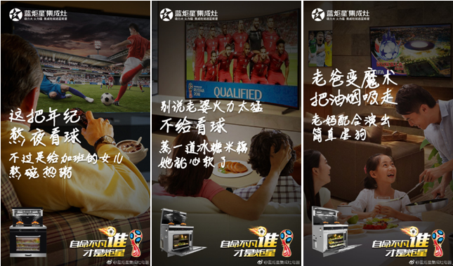 為了爭得看球許可而下廚哄老婆的男人、為了給加班的女兒做宵夜而假裝看球的老父親,這些可愛的人物,不就是茫茫觀眾中的你我他么?藍(lán)炬星集成灶聚焦這些觀看世界杯的“主角”, 通過銜接產(chǎn)品功能與情感、精準(zhǔn)覆蓋用戶觸點(diǎn),成功觸及消費(fèi)者的情感需求并傳遞了品牌溫度,效果尤其顯著,讓人眼前一亮。