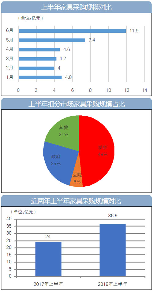 據(jù)《政 府采購(gòu)信息報(bào)》記者不完全統(tǒng)計(jì),上半年,全國(guó)通過(guò)公開(kāi)招標(biāo)、競(jìng)爭(zhēng)性談判和詢價(jià)等采購(gòu)方式共完成家具采購(gòu)項(xiàng)目約2847個(gè),采購(gòu)總金額36.9億元,與2017年同期24億元家具采購(gòu)規(guī)模相比增長(zhǎng)53.75%。其中,1月-4月,家具采購(gòu)額17.6億元,整體表現(xiàn)穩(wěn)中有升;5月-6月,家具采購(gòu)市場(chǎng)迎來(lái)爆發(fā)性增長(zhǎng),這2個(gè)月的總采購(gòu)規(guī)模19.3億元,增幅明顯。