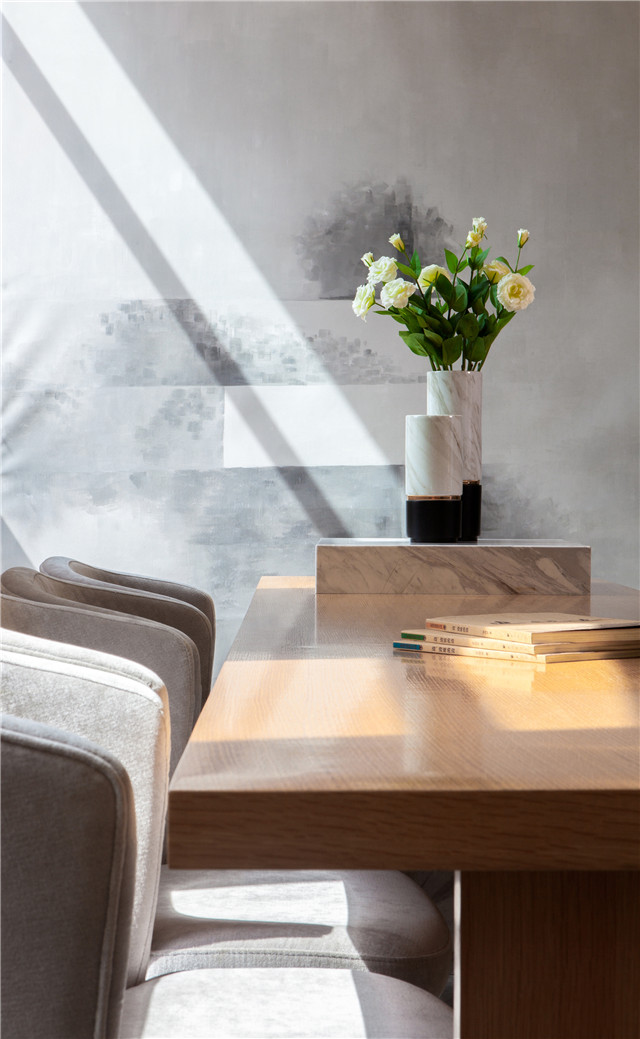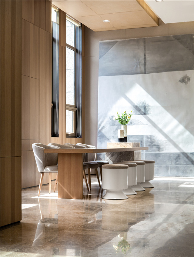 在這個空間中,以交流分享為主要功能,灰色大理石墻面將空間分設為階梯式交流區(qū)及會議區(qū),呈現空間的獨立性與交流的便捷性。會議區(qū)設計用微弱柔雅的光影效果、空靈的吊燈與花藝、抽象的工藝品與藝術掛畫,營造安靜私密的氛圍。