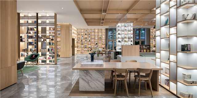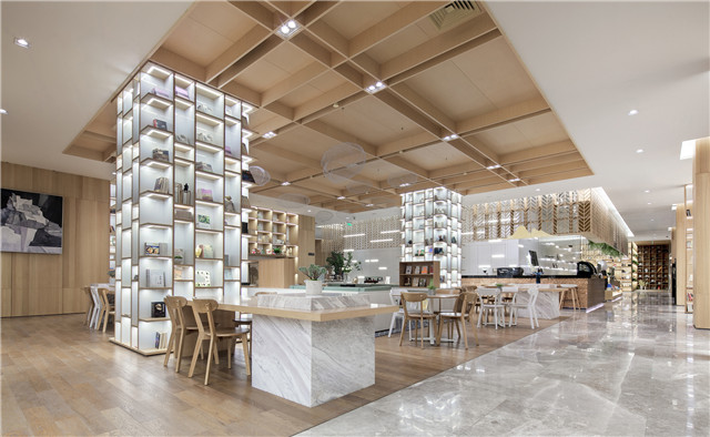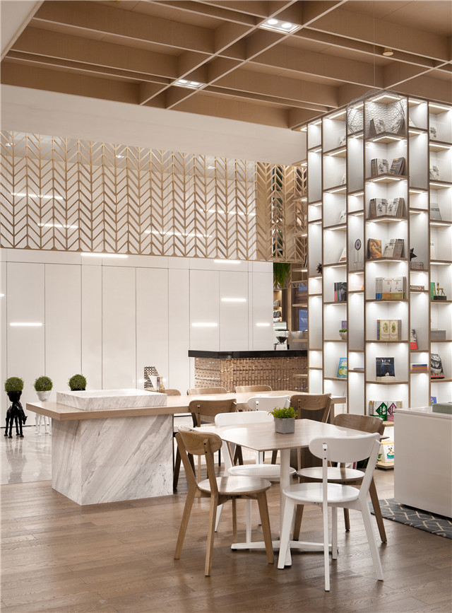 書院的接待臺以輕盈簡潔的燈飾、嵌合木柵的水紋狀大理石臺面,奠定空間的簡潔不繁麗的設計基調。接待臺以外的空間,通過與主題格調統一的材料、色調,圍建起相生相通的幾個功能空間——藝術回廊、閱讀區(qū)、互動活動區(qū)、多功能區(qū)、簽約區(qū)。