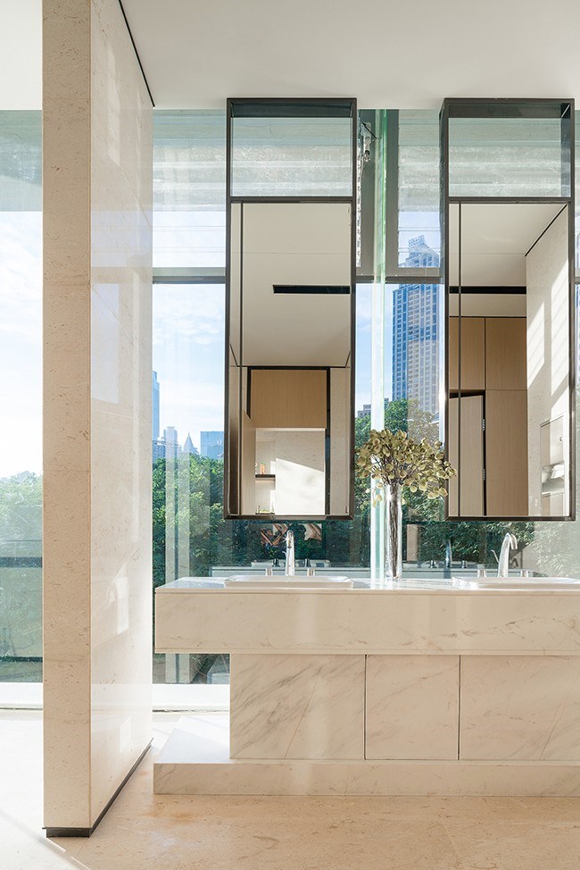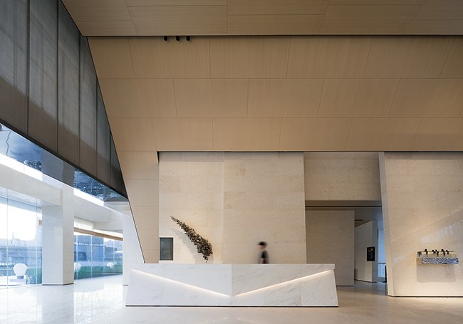 細膩的米色大理石結(jié)構(gòu)空間,相近的木色與之互相映襯,保證了整體色彩的統(tǒng)一性,協(xié)調(diào)建筑體塊塑造的莊嚴肅穆感。挑高的空間架構(gòu)中,通過天花與墻面連續(xù)一體的設計,塑造出空間整體的延伸性,而墻體前后塊面的錯落,塑造出了空間的多維層次感。空間開闊大氣而又不至于一覽無余,簡單中的微妙轉(zhuǎn)折,更新著人們的視覺感受。