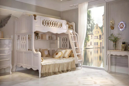 豆丁莊園貴族溫莎城堡套房盡顯高貴優(yōu)雅之態(tài):貝殼白之色彩配以手工擦拭銀粉之工藝,更顯高端大氣。圓潤流暢的線條、上床的安全護(hù)欄、海豚式扶梯和法式芭蕾床腳的結(jié)合,輝映著溫莎王朝昔日的繁華,寓意為孩子帶來幸福與安全。