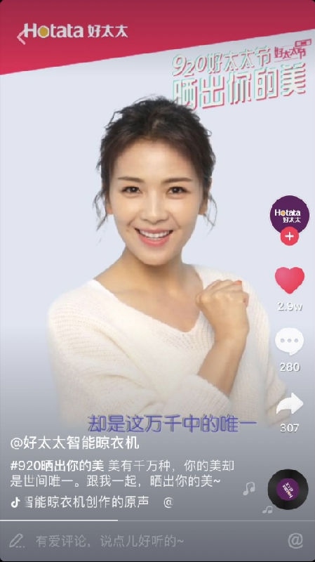 在第二屆920好太太節(jié)來臨之際,廣東好太太集團發(fā)起“第二屆好太太節(jié)——曬出你的美”系列主題活動,在抖音發(fā)起“曬出你的美”挑戰(zhàn)賽,代言人劉濤率先號召,呼吁太太們站起來,自信曬美,引爆全城曬美秀恩愛熱潮,一眾網(wǎng)絡(luò)紅人爭相表白家中好太太,給太太玩驚喜,為太太做家務(wù),幫太太扮靚……一時間為太太做一件暖心事,成為了讓每個丈夫值得驕傲的事。