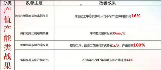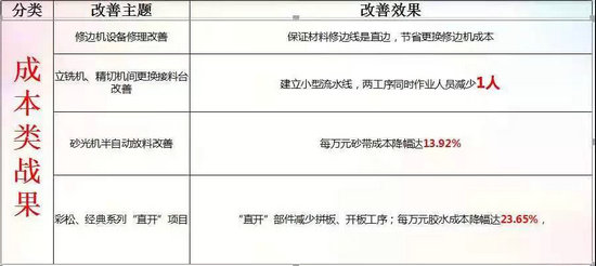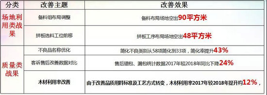 1、典型工藝改善案例:上書架中側(cè)板類成品、層板類厚度優(yōu)化統(tǒng)一;經(jīng)典本色斗柜類工藝改變;部件包裝優(yōu)化,年節(jié)省包裝工時(shí)及紙箱金額達(dá)8358元;
