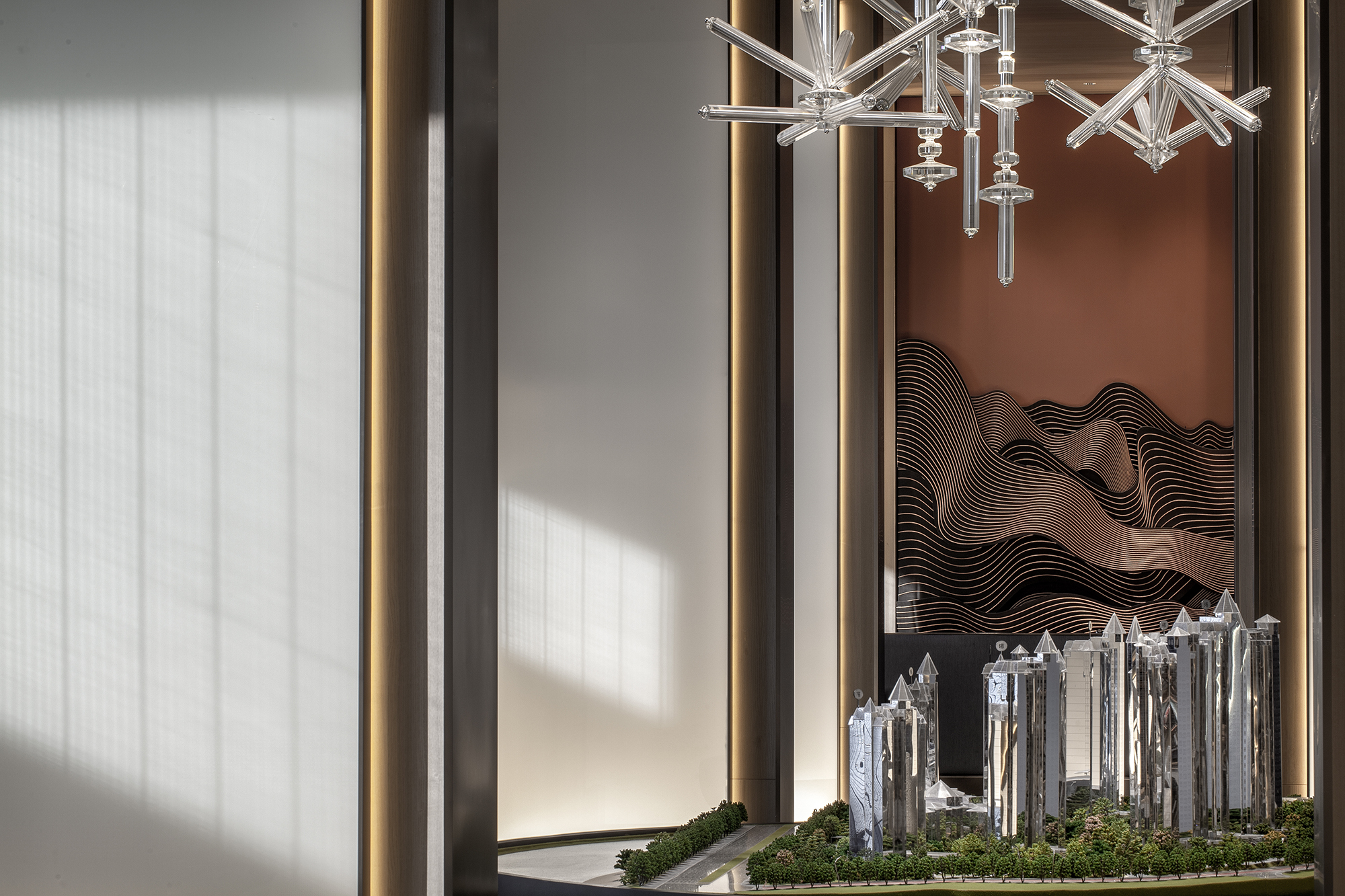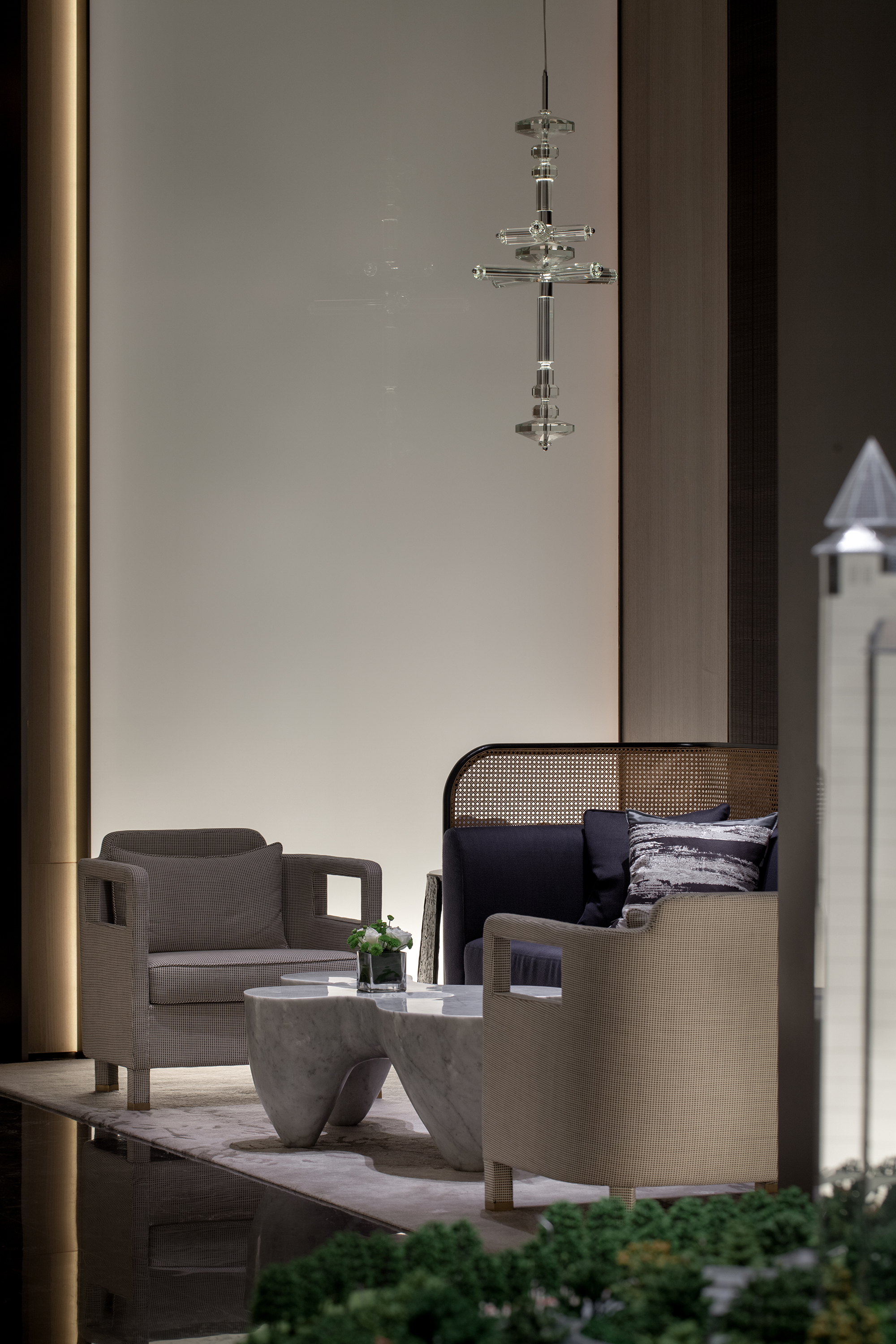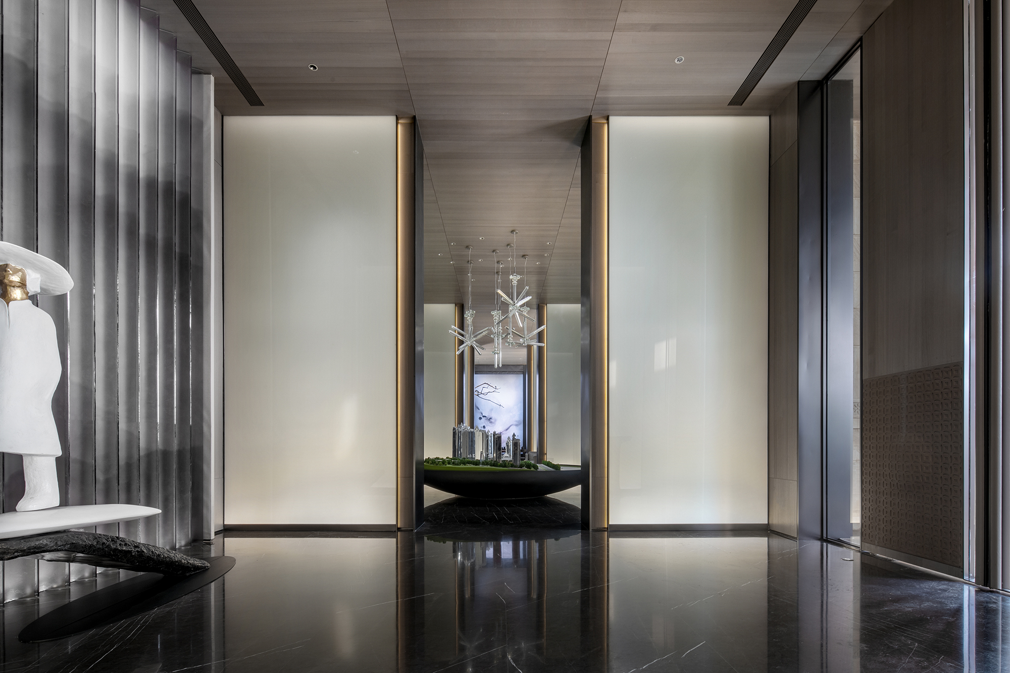 模型區(qū)同樣透溢出如水般清靈安詳?shù)臍庀ⅰT瓌?chuàng)設(shè)計的水晶吊燈,極具現(xiàn)代感的造型與層次,特殊透明材質(zhì)做成的模型,與水晶燈相映成趣。整體空間與左右兩側(cè)的視域相通,形成視覺上的連廊效果,讓空間的韻致無限延伸。