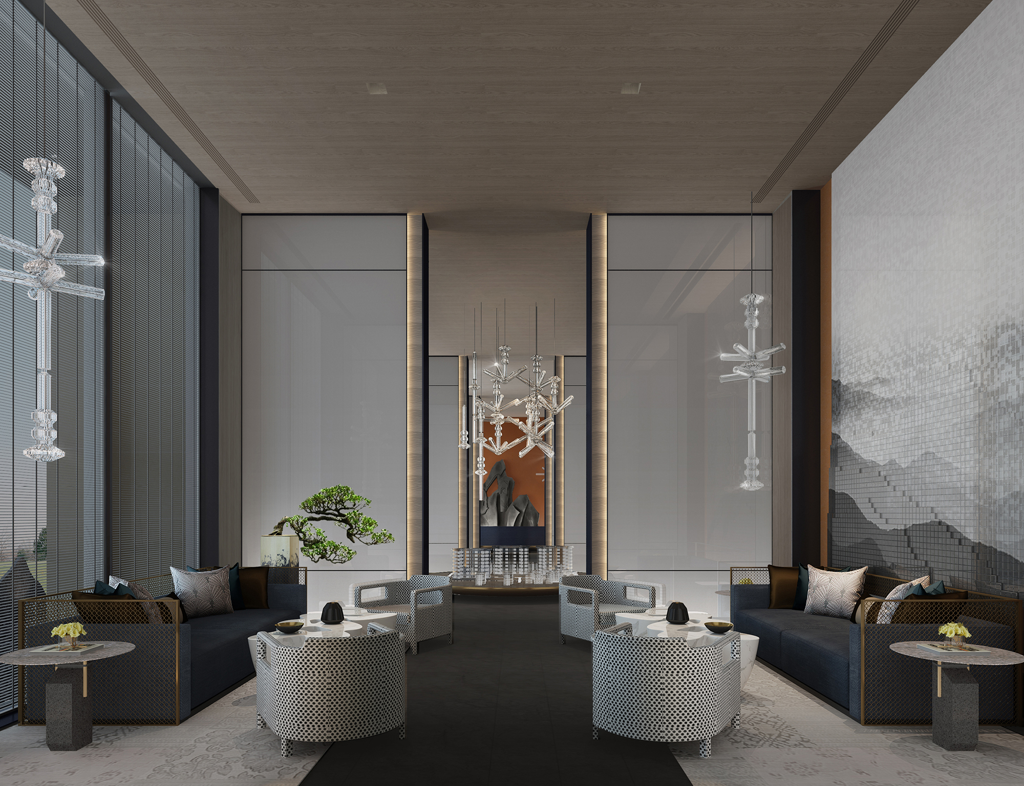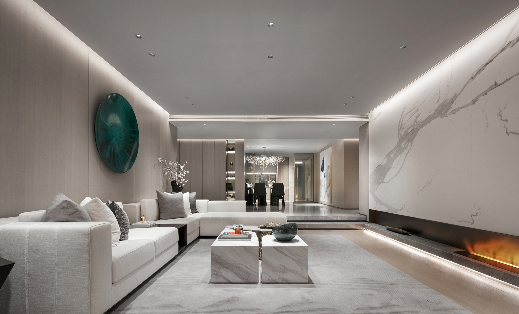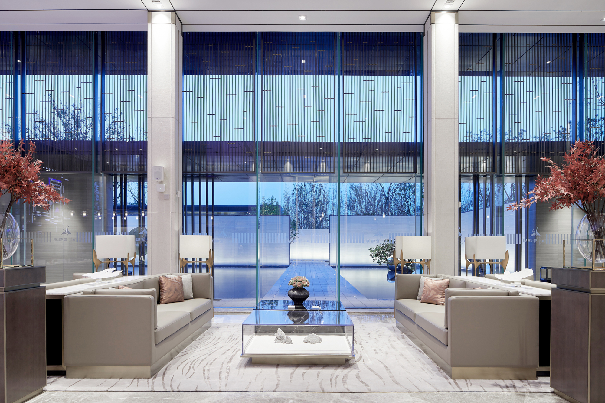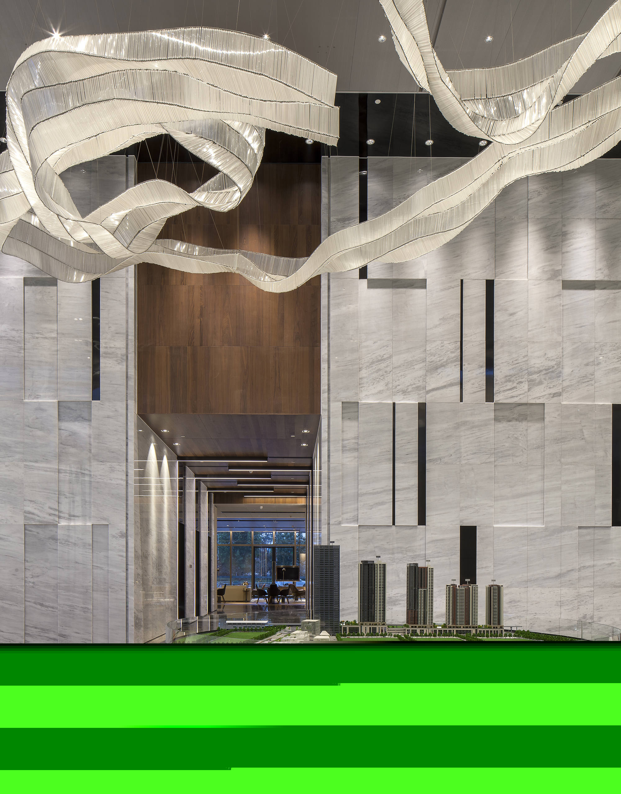 模型區(qū)同樣透溢出如水般清靈安詳?shù)臍庀ⅰT瓌?chuàng)設(shè)計的水晶吊燈,極具現(xiàn)代感的造型與層次,特殊透明材質(zhì)做成的模型,與水晶燈相映成趣。整體空間與左右兩側(cè)的視域相通,形成視覺上的連廊效果,讓空間的韻致無限延伸。