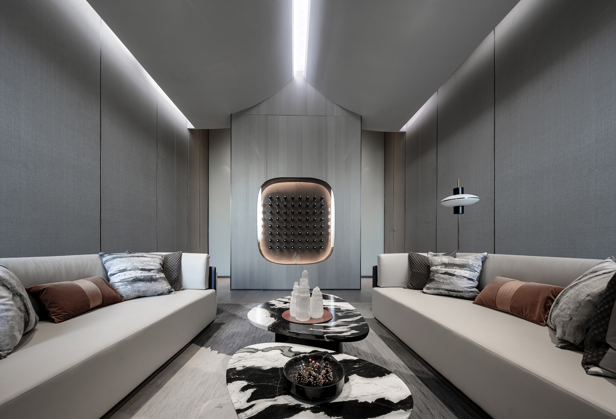 空間糅合著秩序節(jié)奏與空靈飄逸感,軟裝陳設(shè)簡約內(nèi)斂,與整體硬裝渾然一體。留有縫隙的天花吊頂設(shè)計,結(jié)合專業(yè)的燈光氛圍營造,讓整個空間呈現(xiàn)出尊貴、當(dāng)代的不凡氣質(zhì)。