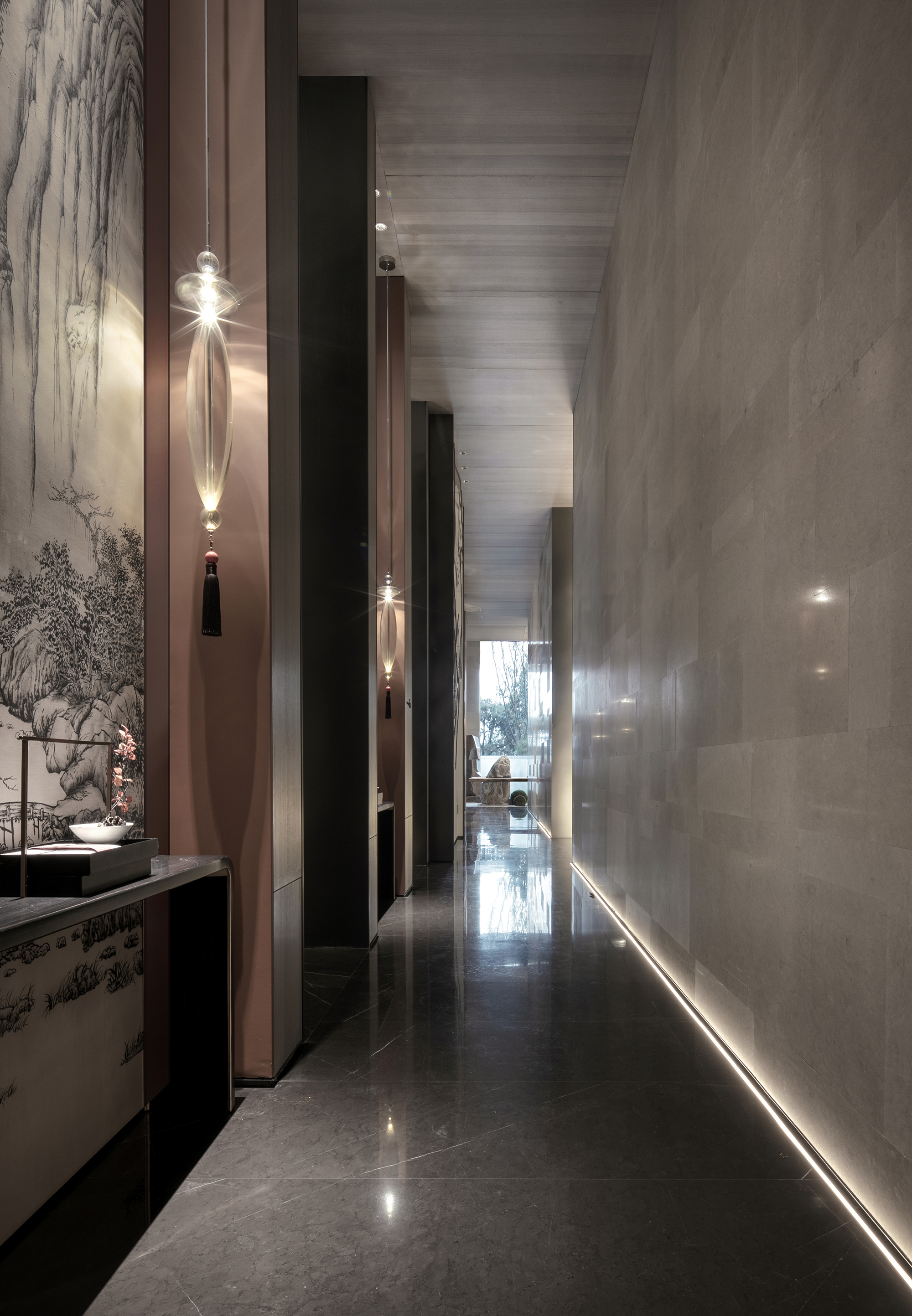 長長的藝術(shù)走廊提升了行走觀覽的意趣,于此,空間演化為可觀可賞的風(fēng)景。寧靜的氛圍縈繞四周,以日本絹布為底材進行的群山手繪圖一一呈于眼前,恰有王心鑒《游青島嶗山》中描述的詩境,精巧的藝術(shù)小品和掛飾,結(jié)合現(xiàn)代手法的藝術(shù)提煉,讓空間的人文韻致悄然生發(fā)。