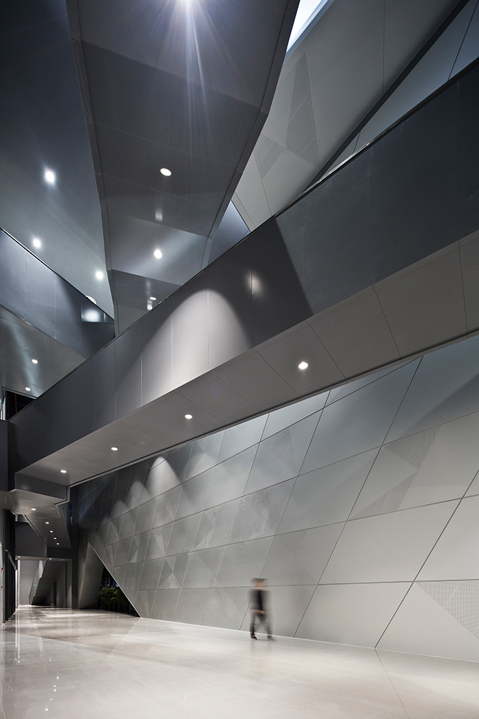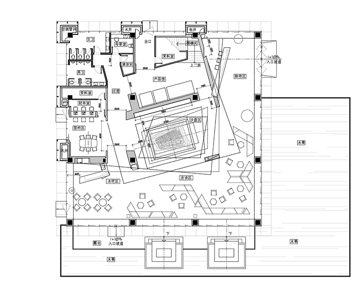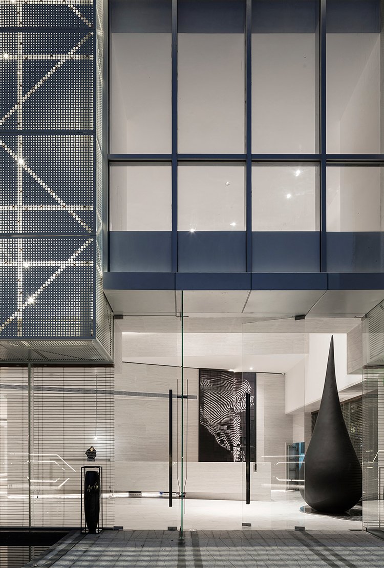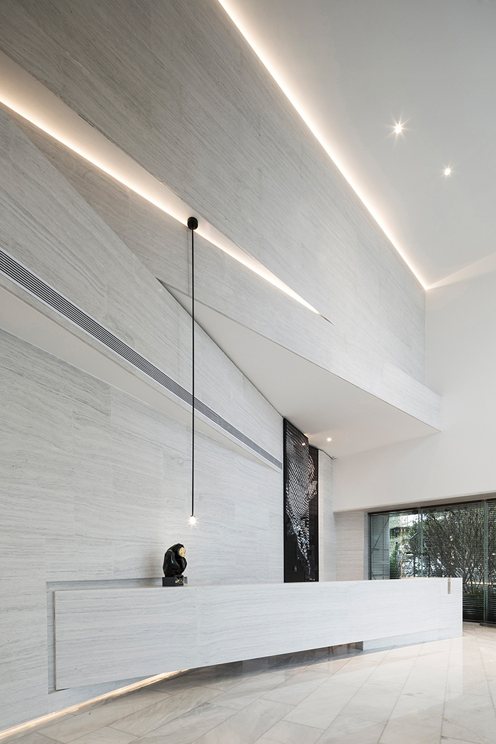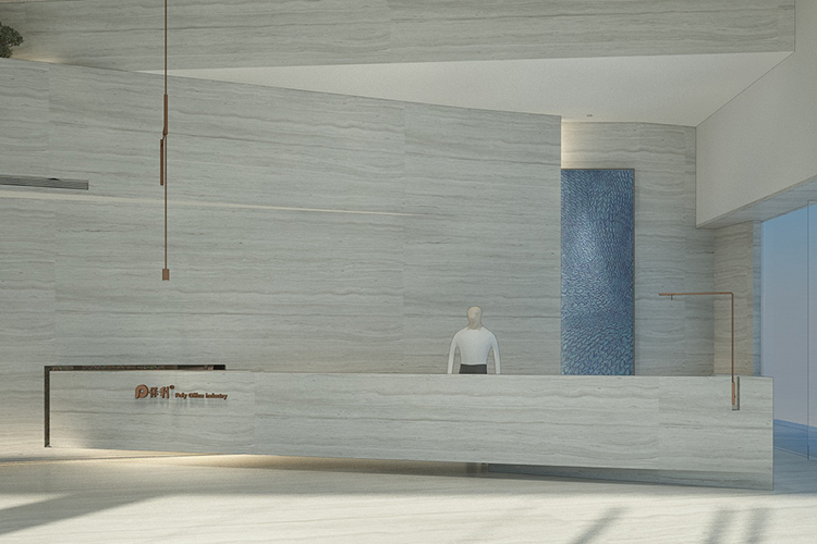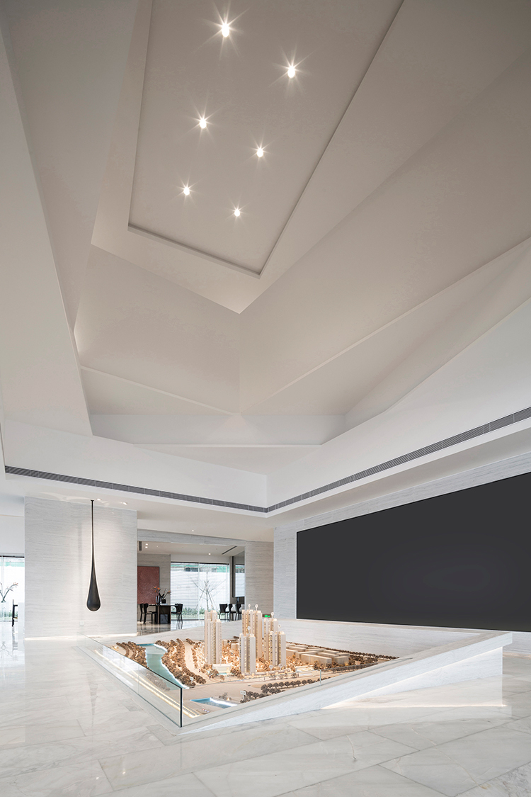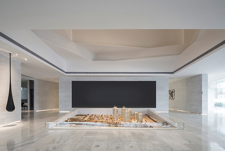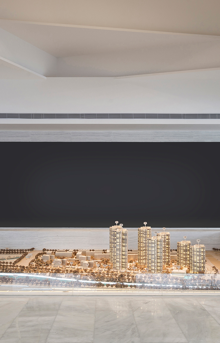 墻面、天花、接待臺(tái)、水吧臺(tái)、陳列柜、沙盤(pán)模型,均以延續(xù)性的塊面元素、創(chuàng)意性而簡(jiǎn)約的視覺(jué)造型、純粹的現(xiàn)代主義美學(xué)及精尚的質(zhì)感,定制出屬于這個(gè)空間的設(shè)計(jì)語(yǔ)言。行進(jìn)空間,建筑體塊的起承轉(zhuǎn)合、層高不一的組合,展演出空間豐富的層次感、轉(zhuǎn)折自然的秩序性。