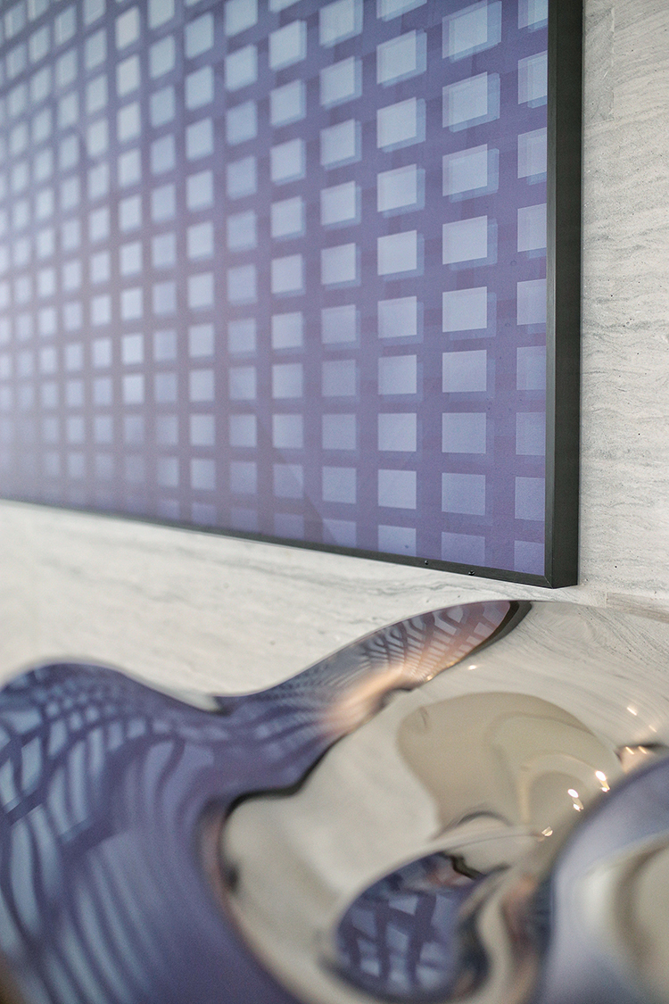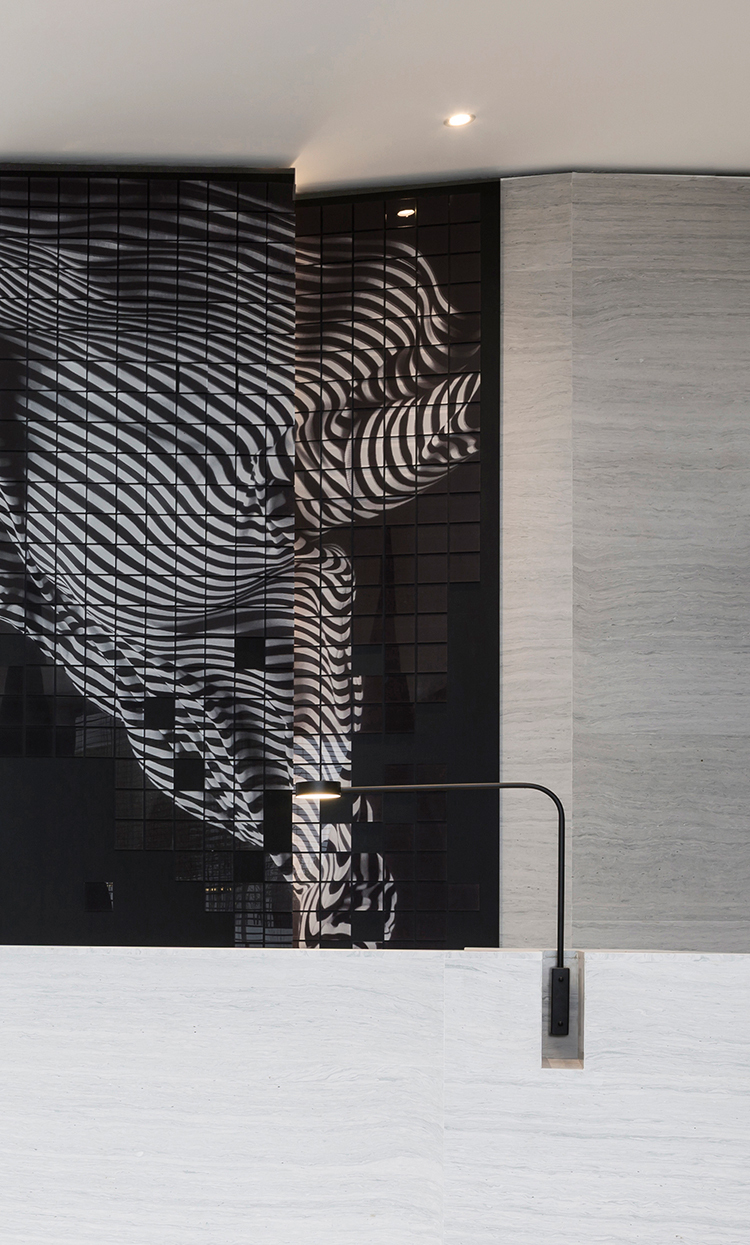 空間中引入大量藝術(shù)裝飾品,將河馬、猩猩、氣球玩偶等具象的形態(tài)抽象化,趣味立顯;而點(diǎn)綴其間的藝術(shù)掛畫(huà)又以線(xiàn)條的無(wú)限重復(fù)形態(tài)呼應(yīng)空間的幾何語(yǔ)言,將水紋的無(wú)形具體化;光影哲學(xué)、視覺(jué)藝術(shù)與自由夢(mèng)幻的思緒融匯于一體,凝練出極具韻律美感的現(xiàn)代藝術(shù)空間。