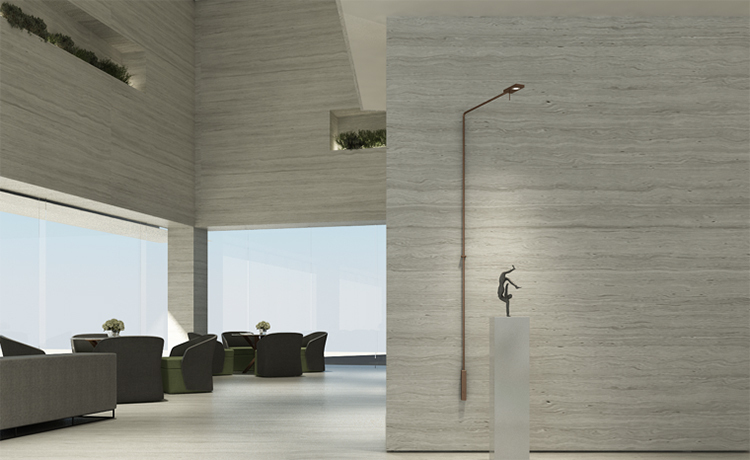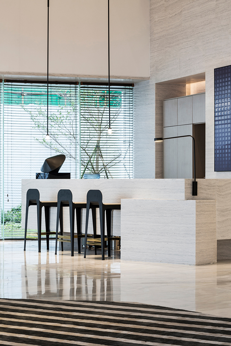 將富有建筑感的體塊元素植入空間中,是ENJOY DESIGN一貫的設(shè)計(jì)語(yǔ)言。設(shè)計(jì)將沿海的巖石層加以線(xiàn)性的提煉、分解并重組,用水泥石材質(zhì)的體塊以錯(cuò)位交叉、層疊組合的形態(tài),在空間中演繹著歲月風(fēng)化的痕跡,呈現(xiàn)純粹而有震撼力的觀感。