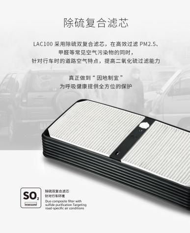 車內(nèi)空氣污染源較復(fù)雜,LAC100  除硫雙復(fù)合濾芯 ,高效過(guò)濾PM2.5、甲醛、硫化物、氮氧化物等常見(jiàn)污染物,針對(duì)行車道路空氣特點(diǎn),提高二氧化硫過(guò)濾能力,真正做到“因地制宜”,為寶寶呼吸健康提供全方位保護(hù)。