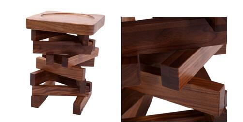 比如接下來的這款9SQ4-05型號(hào)的小凳,造型奇特,超現(xiàn)實(shí)主義的家具設(shè)計(jì)理念蘊(yùn)藏其中,底部看似隨機(jī)的14根木條形成支撐,7層堆積,7個(gè)平面的連接處都運(yùn)用了榫卯結(jié)構(gòu),形成僅有兩三結(jié)點(diǎn)相連的空間錯(cuò)亂感,完美無瑕地留存了黑胡桃木塊的結(jié)構(gòu)和表面紋理,再加上科學(xué)的受力支撐計(jì)算,一個(gè)集實(shí)用性和美觀性為一體的裝飾小凳就此誕生。擺上一盆精心侍弄的綠植或花束,擺在再不起眼的角落,也會(huì)是一道吸人眼球的亮麗風(fēng)景。