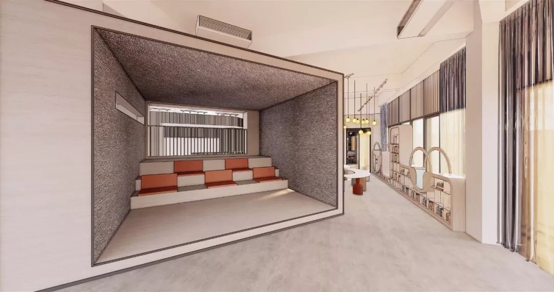 階梯小劇場(chǎng)以盒子的形意巧妙內(nèi)置,區(qū)隔安靜沉謐的書(shū)塔區(qū),劃分出一個(gè)吸引人們注意力、讓人全情沉浸的投影空間,此間柔軟的抱枕小物提供最大限度的舒適感,平日里是親子互動(dòng)寓教于樂(lè)、共同學(xué)習(xí)的好去處,亦承載著發(fā)布會(huì)或其它社交活動(dòng)的功能定位。