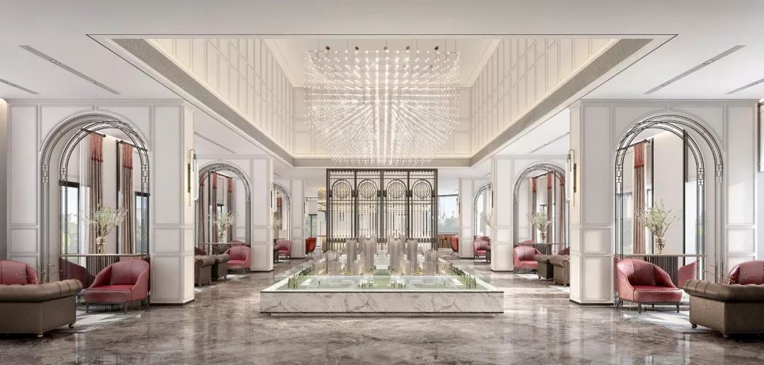 軟裝設(shè)計(jì)中,大廳呈對(duì)稱(chēng)構(gòu)圖,璀璨耀眼的立體矩塊燈陣,星星點(diǎn)點(diǎn)的細(xì)節(jié)拼湊出米字的大致輪廓,又似不經(jīng)意間抒寫(xiě)著英倫格紋的疏密意象,層疊有致,意態(tài)萬(wàn)千;洽談區(qū),在歐式花線(xiàn)圓拱形制的隔斷基礎(chǔ)上,黑色鐵藝架、紅色單椅、黑色長(zhǎng)沙發(fā)圍合金色茶幾構(gòu)就一個(gè)舒適放松的商務(wù)對(duì)談空間;飄香玉蘭、復(fù)古時(shí)鐘、噴泉雕塑無(wú)一不彰顯著精致細(xì)節(jié),光影綽約間,英式情調(diào)漫延。