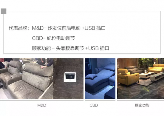 當(dāng)然,智能家居不僅在寢具領(lǐng)域,沙發(fā)產(chǎn)品也沒有落下。例如沙發(fā)電動功能位的出現(xiàn)更加頻繁,并且變化的范圍更多,除了傳統(tǒng)的腿部抬高功能外,開始出現(xiàn)座位前后調(diào)節(jié)、上下調(diào)節(jié)的功能;通過功能五金以及與遙控裝置的對接,頭靠與腰靠的調(diào)節(jié)更加多元及便利;USB等智能接口全面普及等等。