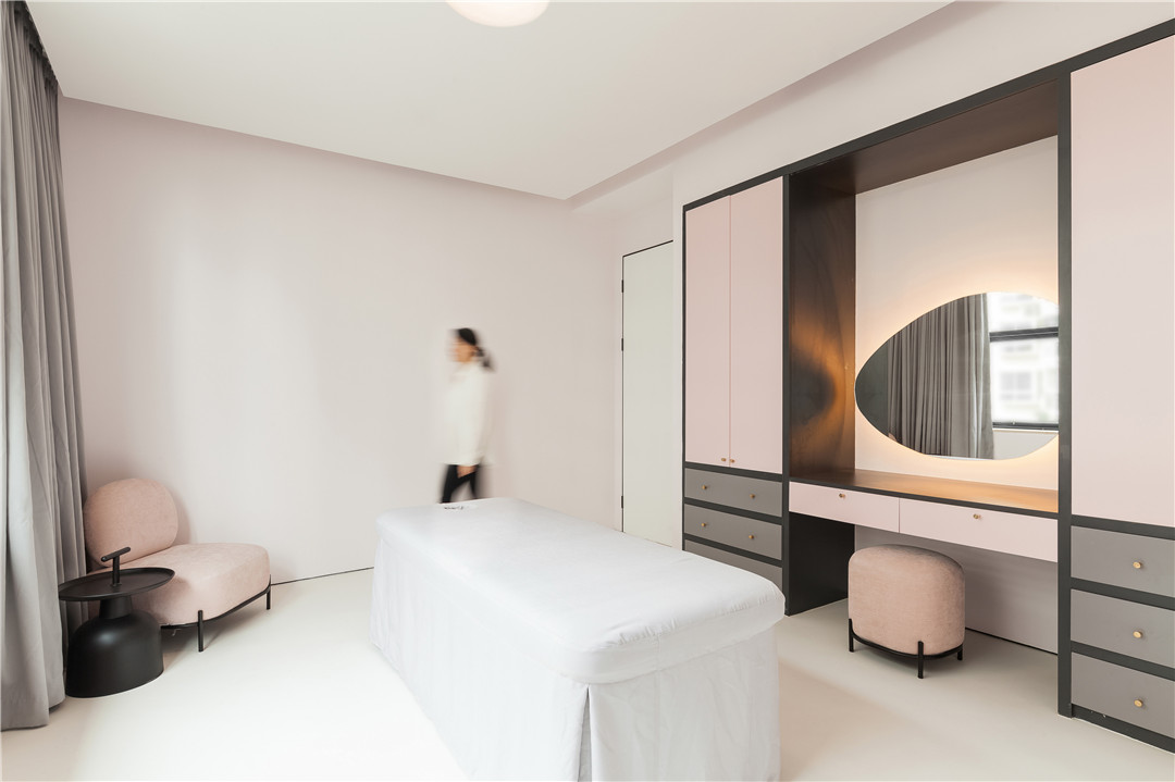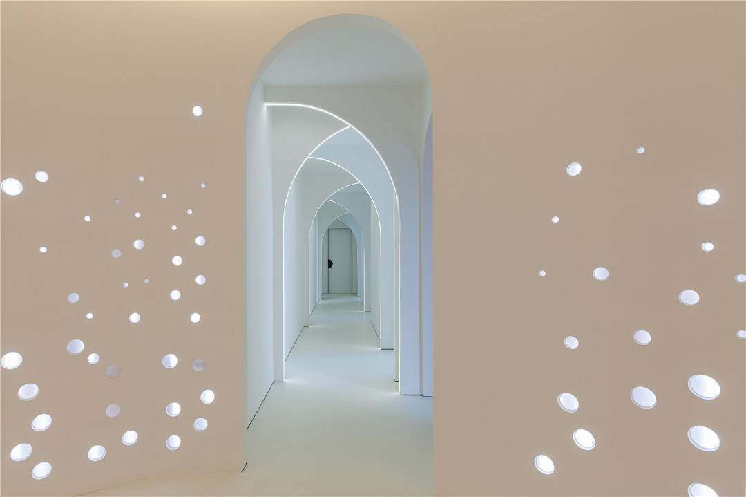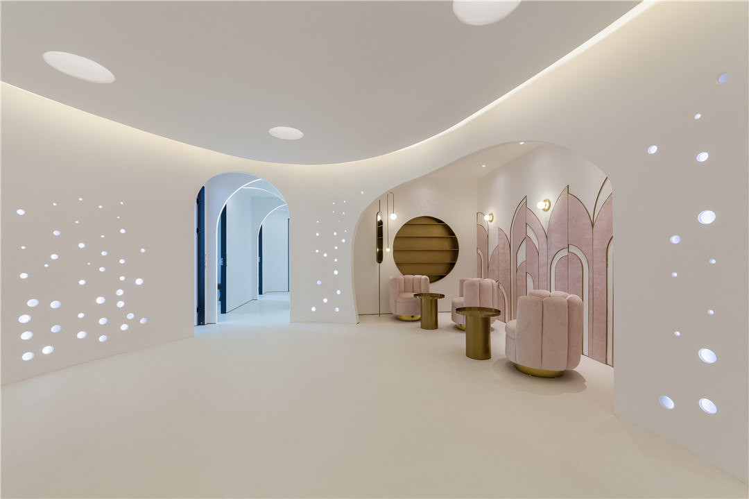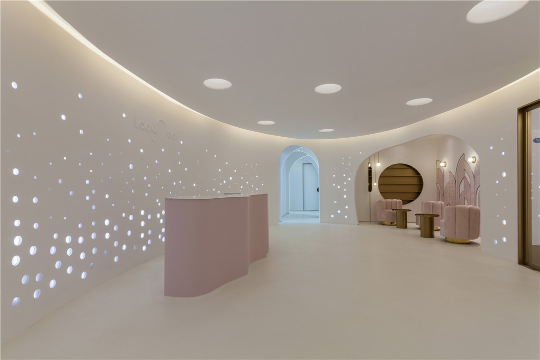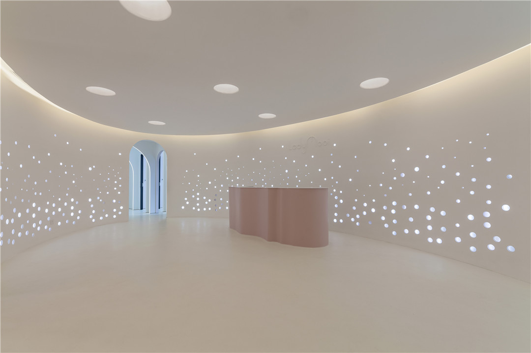本次獲獎(jiǎng)作品《lady mooi 女子醫(yī)療美容機(jī)構(gòu)》其靈感源自兩歲女兒的睡前故事,設(shè)計(jì)摒棄了以往該類型空間所采用的慣常的符號(hào)化做法,以“人魚公主”的故事為設(shè)計(jì)靈感,提取氣泡、水等夢(mèng)幻元素,營(yíng)造輕松、舒適、浪漫的環(huán)境,讓愛美的顧客們?cè)谶@里有仿佛置身夢(mèng)幻水世界的感受。一圈沖孔板從下往上、由大到小不規(guī)則排列,仿佛海底世界的氣泡,簇?fù)沓扇彳?、純凈的橢圓形空間。過道用燈帶鑲嵌半弧形攻門,錯(cuò)落之間,一步一世界,那份變身的莊重在魔法的推演中漸漸實(shí)現(xiàn)。