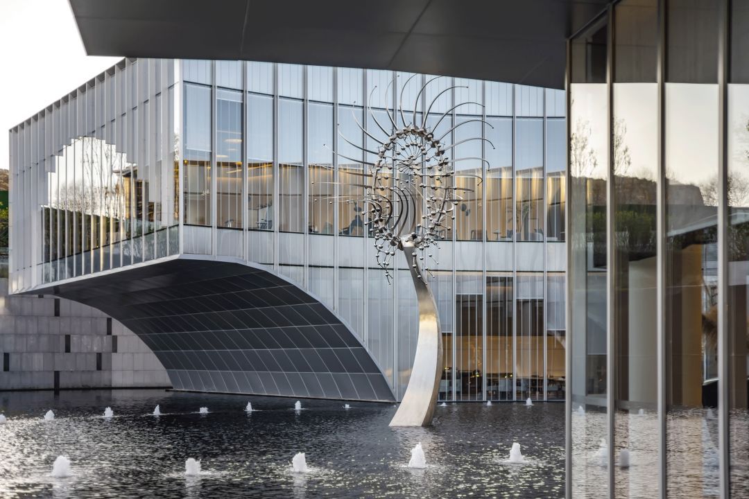 接待區(qū)就在這一理念之下,景觀以水之形態(tài)為伊始展開,而后又融入了似水也像風的流動意象,互相依融互不侵犯,這種結合東方元素的處理,又與建筑外觀的極盡現代形成對比。
