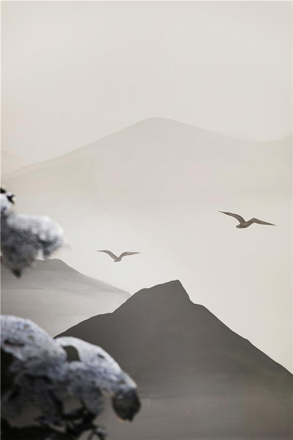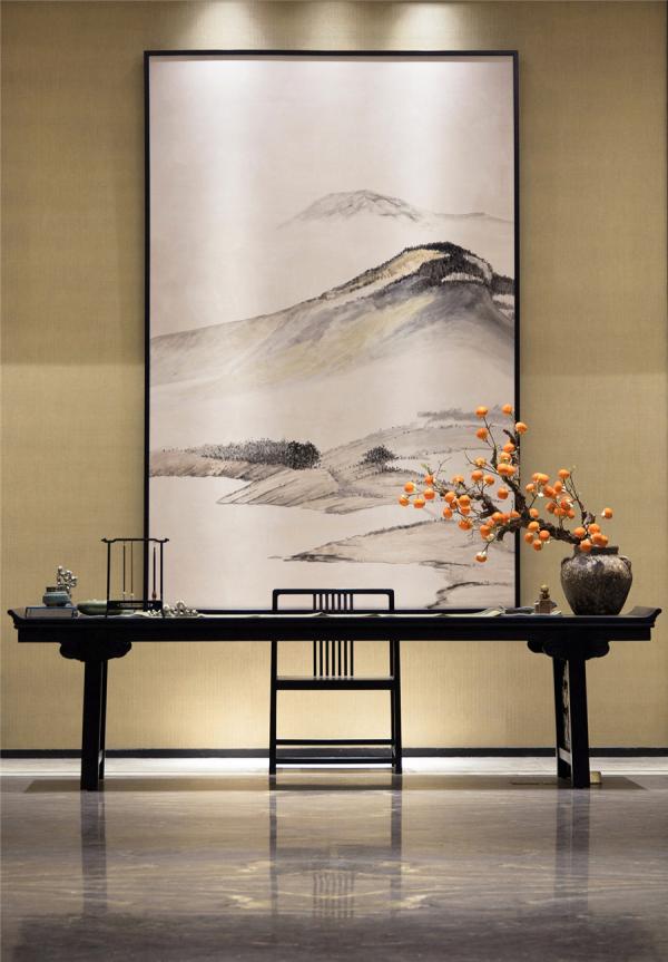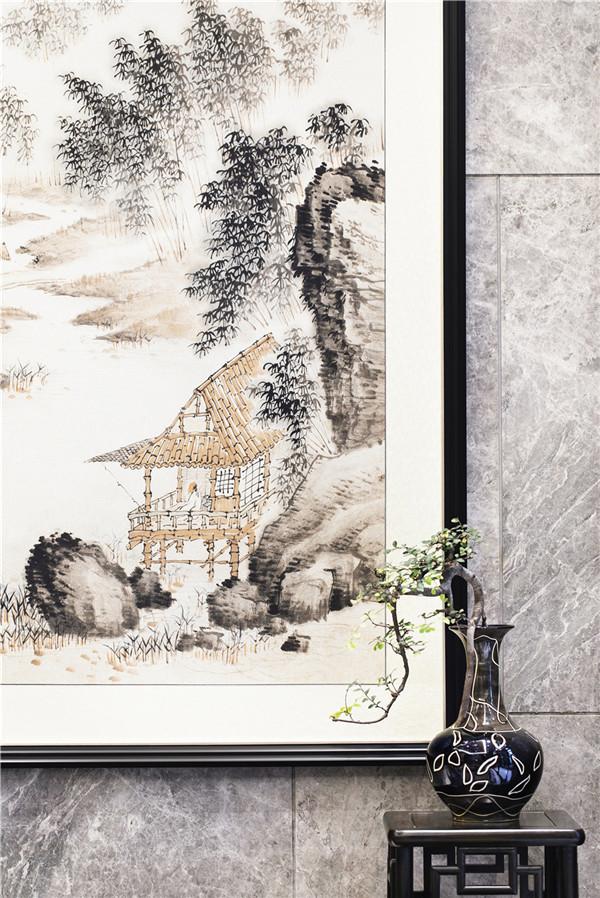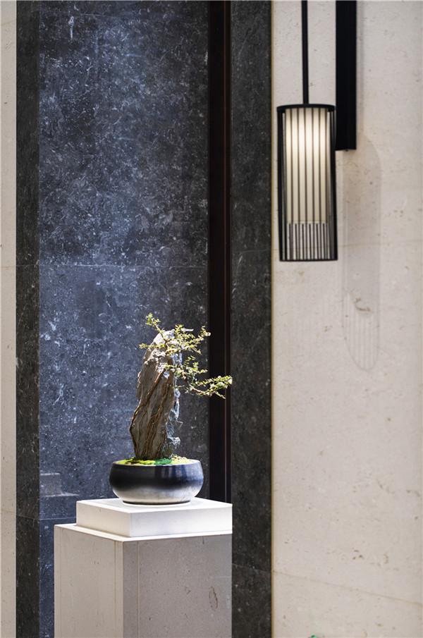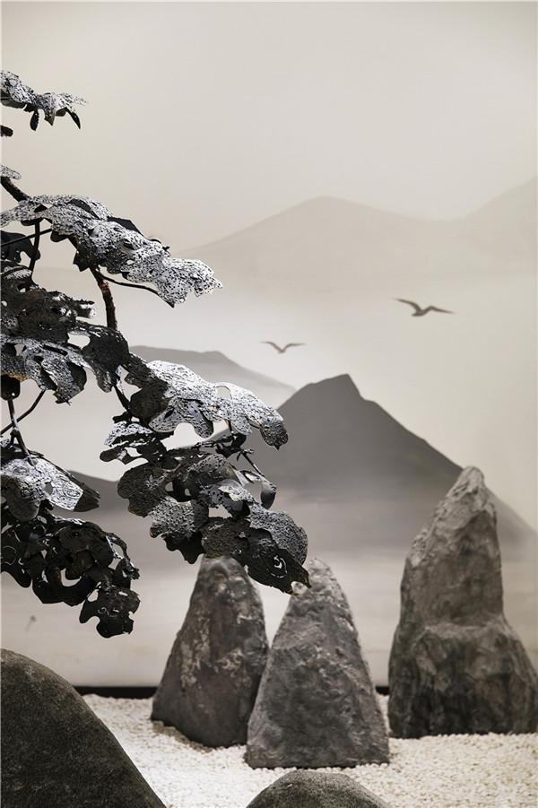 移步下階,見(jiàn)水墨山川順沿蜿蜒周折的樓梯走勢(shì),盤旋錯(cuò)落。云霧縹緲間,紅楓葉落,勁松蒼翠,山巒疊嶂,意境雅雋。山石與蒼松的精巧端景,映襯著山水畫(huà)的意境,人文自然的隱逸美散落在虛實(shí)之間,自在由心。