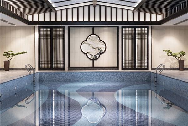 古建天花形制下,游泳館延續(xù)窗欞的框景手法,以海棠紋窗欞框就一幅大理石材質(zhì)的山水意景畫(huà),柳條紋格柵則對(duì)仗分布兩側(cè),斑駁光影透漏而出,寫(xiě)意影影綽綽的線條形制美,呼應(yīng)整個(gè)空間的中式意蘊(yùn)。