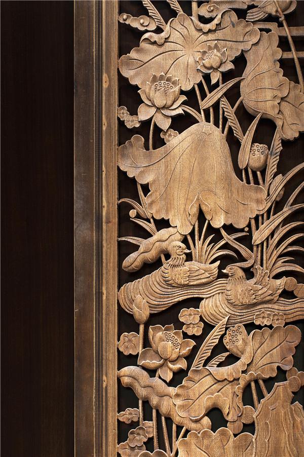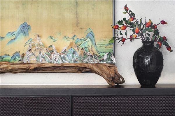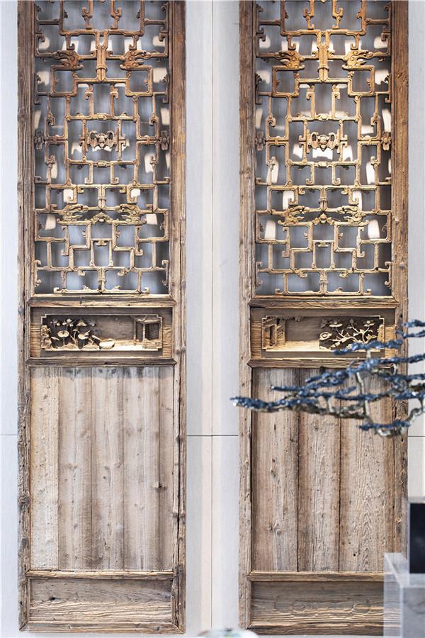 禪茶室中,當(dāng)?shù)刂窬幪旎ㄣ暯有沃聘鳟惖氖肿髦裰茻麸棧佌归_(kāi)一室古雅清愜。以舊瓦堆疊的墻面帶著歲月的紋路,斑駁光影點(diǎn)染老木頭細(xì)雕雙龍、花木的窗欞,萬(wàn)里江山圖與透明山石小景的虛實(shí)映襯,豐盈了這份古典況味。