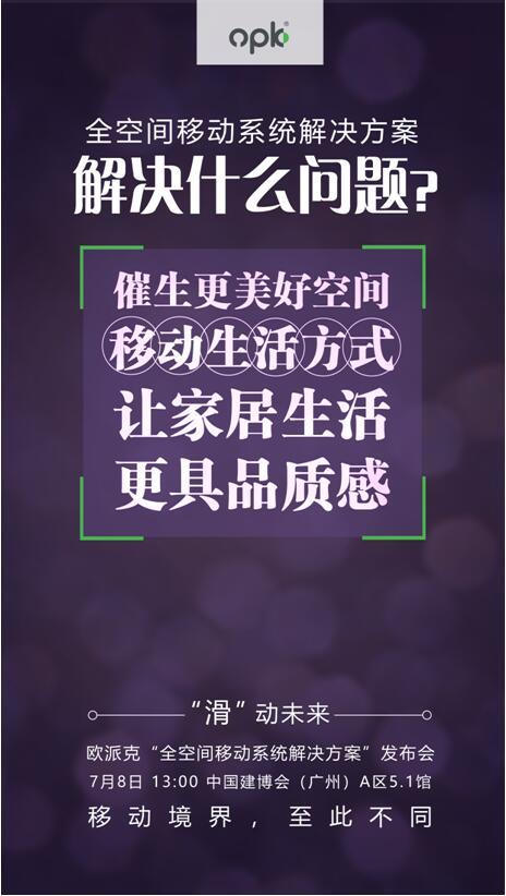 2019廣州建博會上,歐派克將首度發(fā)布“全空間移動系統(tǒng)解決方案”,將產(chǎn)品從滑輪單品轉(zhuǎn)向以滑輪為主導(dǎo)的,涵蓋客廳空間、陽臺空間、餐廳空間、廚房空間、衛(wèi)浴空間、臥室空間、衣帽間空間、書房空間的全空間定制解決方案,這不僅是歐派克品牌自身的重大突破,也將為定制行業(yè)揭開未來新篇章。