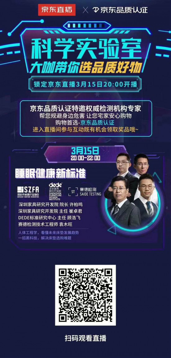 于是,電商巨頭京東和深圳時(shí)尚家居設(shè)計(jì)周全面牽手,以品質(zhì)為核心,以高標(biāo)準(zhǔn)和獨(dú)特標(biāo)準(zhǔn)為基礎(chǔ),聯(lián)合深圳家具研究開發(fā)院標(biāo)準(zhǔn)研究中心,深圳市賽德檢測(cè)技術(shù)有限公司作為技術(shù)單位,打造了一系列線上線下活動(dòng)。用專業(yè)檢測(cè),為消費(fèi)者提供更有權(quán)威和說(shuō)服力的品質(zhì)產(chǎn)品,這是京東和深圳時(shí)尚家居設(shè)計(jì)周達(dá)成戰(zhàn)略合作的契機(jī),也是3月18日這場(chǎng)“好睡眠、新標(biāo)準(zhǔn)”線上發(fā)布會(huì)如此吸睛的原因。此次發(fā)布會(huì)由京東家具、深圳市家具行業(yè)協(xié)會(huì)、深圳時(shí)尚家居設(shè)計(jì)周發(fā)起,深圳家具研究開發(fā)院標(biāo)準(zhǔn)研究中心,深圳市賽德檢測(cè)技術(shù)有限公司作為技術(shù)單位聯(lián)合推出。