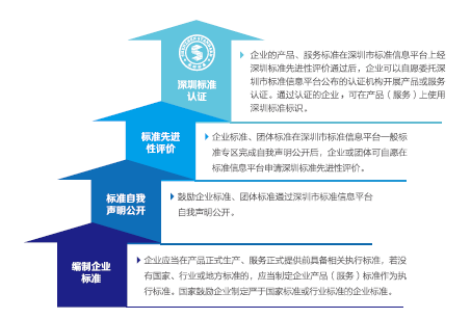 編制標(biāo)準(zhǔn)(或者執(zhí)行通過評(píng)價(jià)的團(tuán)體標(biāo)準(zhǔn)、地方標(biāo)準(zhǔn))—標(biāo)準(zhǔn)自我聲明公開 — 通過深圳標(biāo)準(zhǔn)先進(jìn)性評(píng)價(jià)(團(tuán)標(biāo)和地標(biāo)無需再評(píng)價(jià)) — 委托深圳標(biāo)準(zhǔn)認(rèn)證 — 頒發(fā)深圳標(biāo)準(zhǔn)認(rèn)證證書。