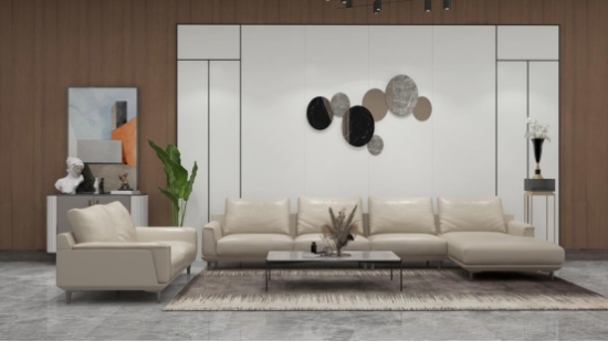 CBD家居·白金 | BS105沙發(fā)整體造型遵循簡約風(fēng)格,柔和淡黃皮質(zhì)在燈光下自有一種高貴典雅氣質(zhì),靜立于客廳中給慵懶休閑空間增添一絲雅致。