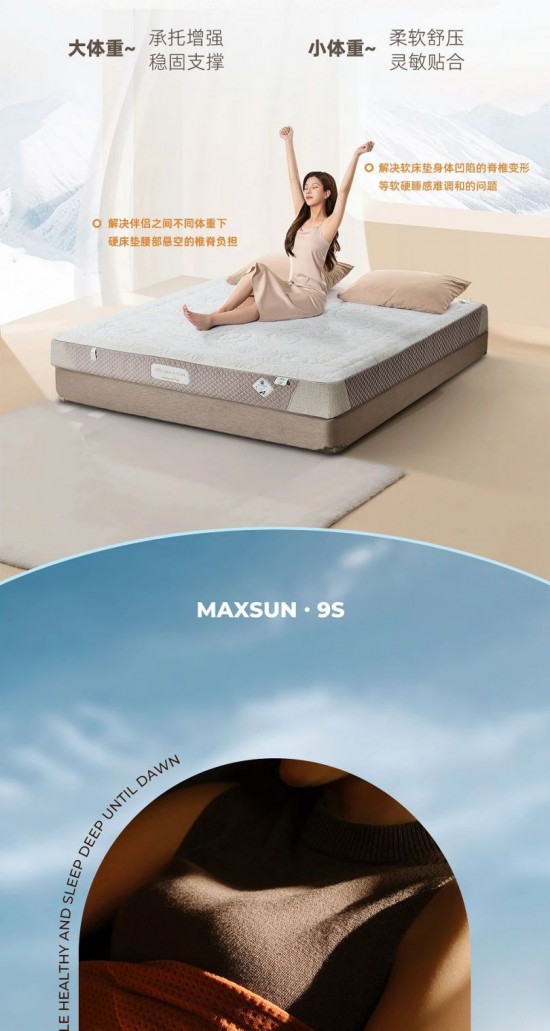 核心提示:MAXSUN·9S奢享床墊,自動適應(yīng)身形體重,自由任意睡。