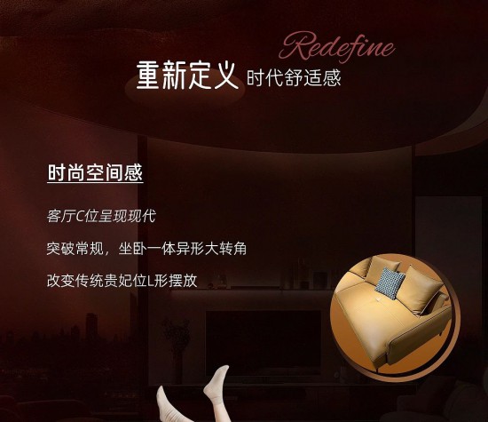 核心提示:客廳C位呈現(xiàn)現(xiàn)代,突破常規(guī),坐臥一體異形大轉(zhuǎn)角,改變傳統(tǒng)貴妃位L形擺放。