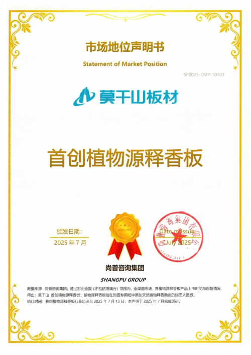 當家居消費從“功能需求”轉向“情緒價值”,莫干山板材以植物源技術交出了一份創(chuàng)新答卷。近日,尚普咨詢正式認證莫干山板材“首創(chuàng)植物源釋香板”身份,并出具《市場地位聲明書》。這一認證不僅標志著云峰莫干山在板材功能創(chuàng)新上的領跑地位,更為家居行業(yè)開辟了“功能+情緒”的全新賽道。