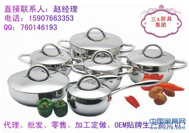 高檔不銹鋼廚具、湯鍋、炒鍋、煎鍋、奶鍋、蒸鍋、刀叉、碗筷碟子等眾多款式,批發(fā)、零售、代理還可以加工定做,OEM貼牌生產(chǎn)!廠家直銷?。?!櫥柜、炊具等產(chǎn)品配套的最佳選擇!消費者最愛的禮品,贈品!