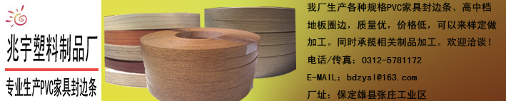 雄縣兆宇塑料制品廠是一家主要生產(chǎn)PVC仿木紋家具封邊條、U型扣、地板圈邊的專業(yè)工廠。我廠擁有多套生產(chǎn)設(shè)備,